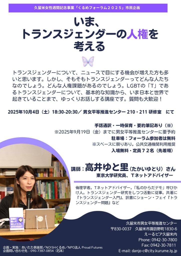 2025年10月4日。久留米女性週間記念事業「くるめフォーラム2025」市民企画の一部として「いま、トランスジェンダーの人権を考える」と題する講演を行いました。久留米は女性運動がとても盛んな街で、そのなかには、この「フォーラム」で毎年かならずLGBTQに関する内容の講演・勉強会を企画して下さっている方たちがいます。わたしの登壇した企画もその1つであり、今年の主催は「あいたた倶楽部/NO!SHくるめ/NPO法人 Proud Futures」の3団体でした。(No!SHさんは、日本初のセクハラ裁判を闘う原告さんを支援してきたグループ「NO!SH」(ぐるうぷ:NO!セクシュアル・ハラスメント)さんです)