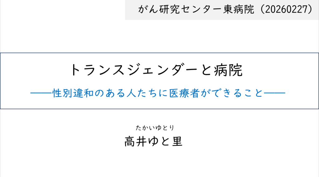 2026年2月27日。国立がん研究センター東病院にて講演を行いました。招いてくださったのは、LGBTQ支援を行っているチームの皆さまで、対面会場とオンライン(配信)のハイブリットでの実施でした。講演タイトルは「トランスジェンダーと病院――性別違和のある人たちに医療者ができること――」とし、主には患者さんとしてトランスジェンダーやノンバイナリーの方が来院・通院・入院するケースを念頭に置いた話をしました。